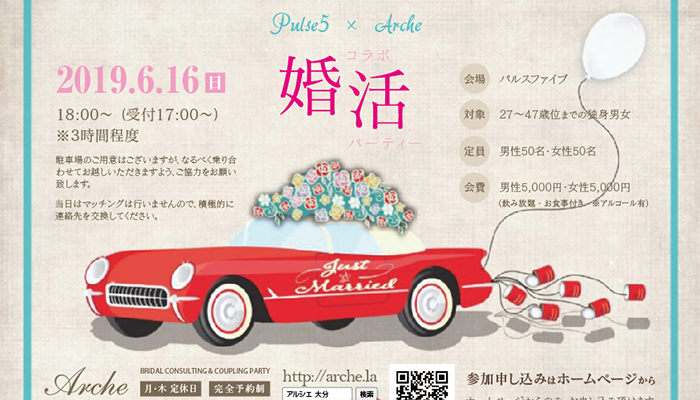 【終了】2019年6月16日(日)コラボ婚活パーティー「PULSE5 × アルシェ」大分市城崎町18:00~| 大分で婚活するなら結婚相談所 アルシェ