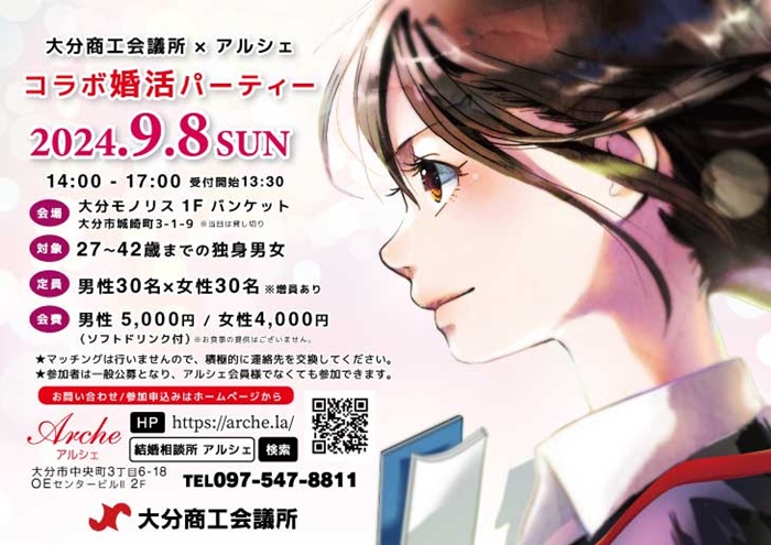 大分の結婚相談所「アルシェ」から コラボ婚活パーティー残席の報告 開催日まで約1ヵ月となりました☆ 男女ともに続々と予約が入っております♡ 駆け込みが多いのでお早目のご予約を☆ 毎回、コラボ開催される商工会議所の婚活イベントは 大好評にて開催され... -