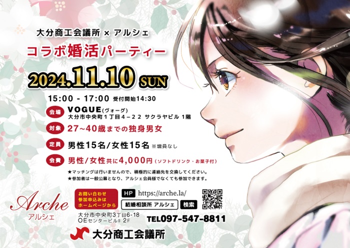 大分の結婚相談所「アルシェ」から 婚活パーティーのお知らせです。 本日、今年最後の婚活イベント(*^^)v 今回も大分商工会議所とのコラボ 6000社に告知チラシが配布されました。 えんむす部にて配信も沢山していただきました♡ 30名収容できる会場を完全貸... -