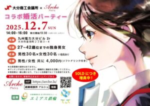 大好評!SOLDにつき増員中! 大分での婚活を応援する「アルシェ」が 企画・運営する婚活パーティーです。 大分商工会議所 × Arche-アルシェ- コラボ婚活パーティー 【協賛】エミアス鉄輪 / てtoて 株式会社BL … 続きを読む 【★終了★】2025年12月7日(日)大分商工会議所 × Arche-アルシェ-コラボ婚活パーティー「九州電力大分ビル 1F・2F」14:00~